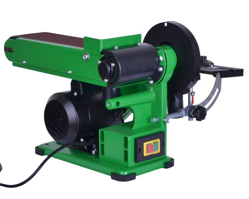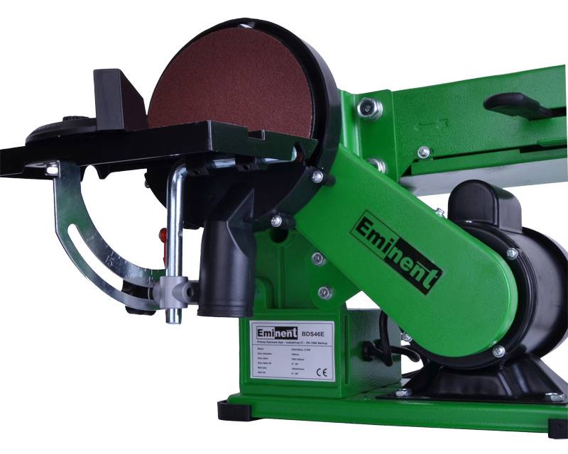 Bemærk slibebåndets store slibeareal og at hele slibearmen kan justeres fra vandret til lodret position. Tallerkensliberen er inkl. guide og land, der kan justeres 0-45°.