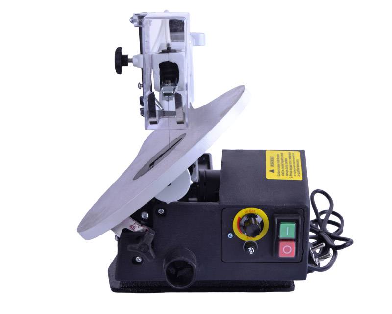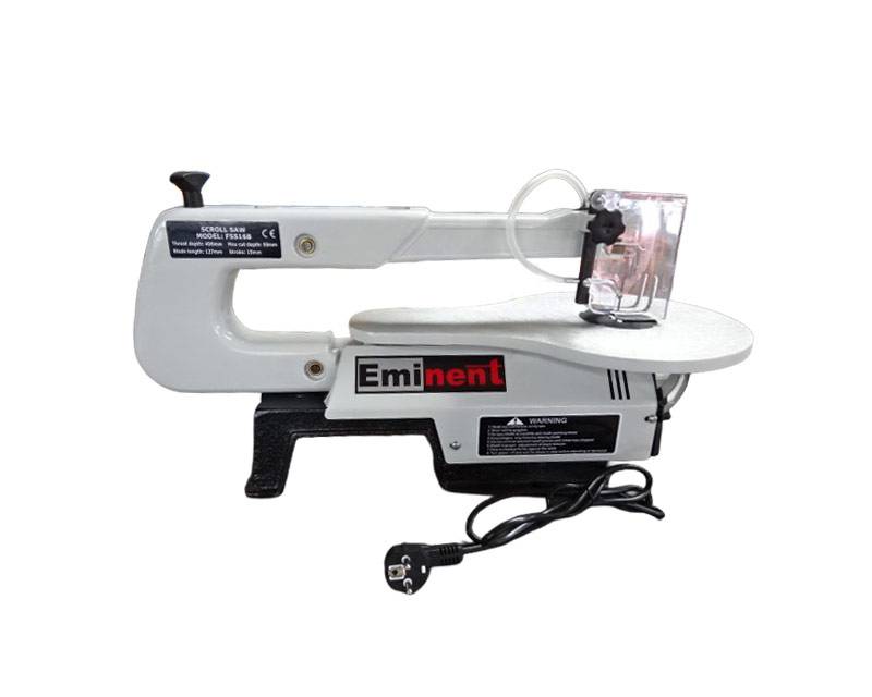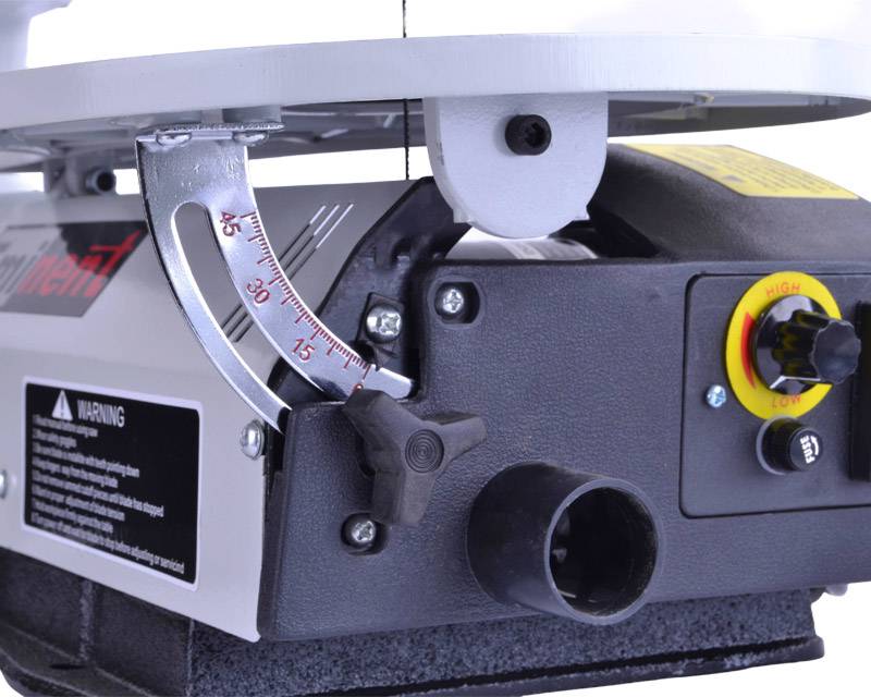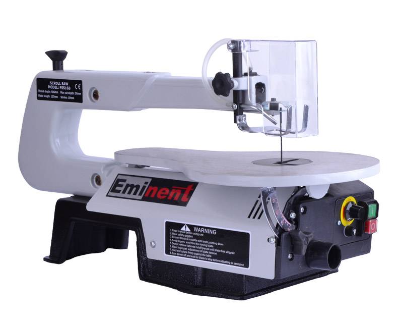 Klassisk dekupørsav med variabel hastighed, støvblæser samt arbejdsbord i aluminium.
