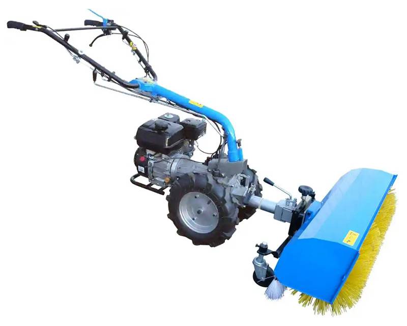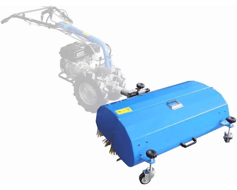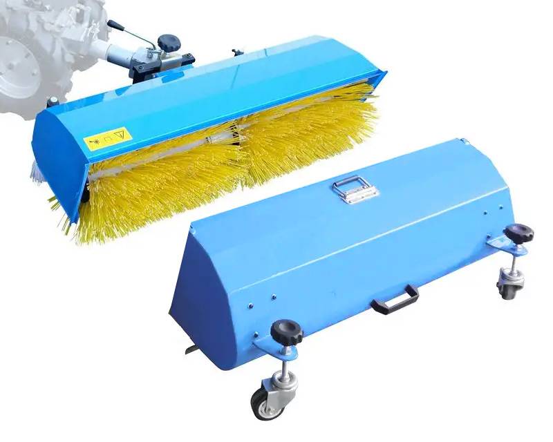 Bred fejemaskine monteret på Güde minitraktor. Hertil kommer opsamler til montering på kosten, når man fx skal feje tæt på vinduer. Oplagt sæt til brug både sommer og vinter.