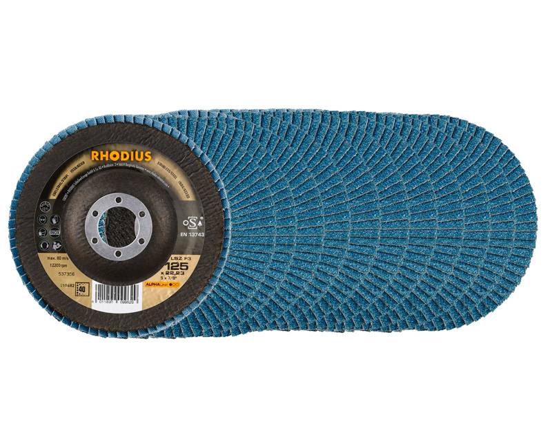 Pakke med 10 stk. flapskiver Ø125 mm. Skiverne er belagt med sandpapir med aluminiums oxid og er speciel udviklet til rustfri stål.