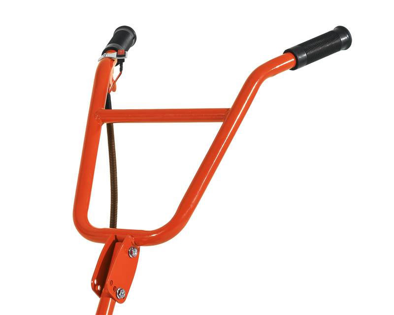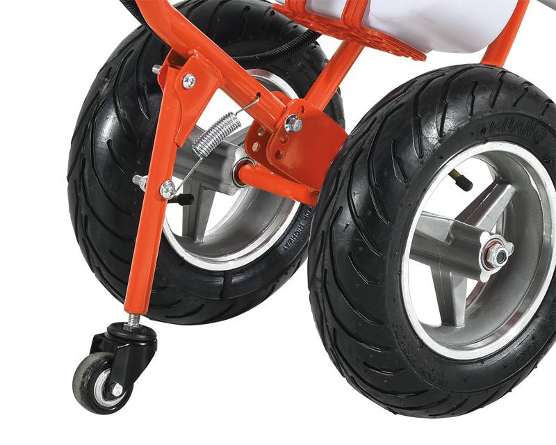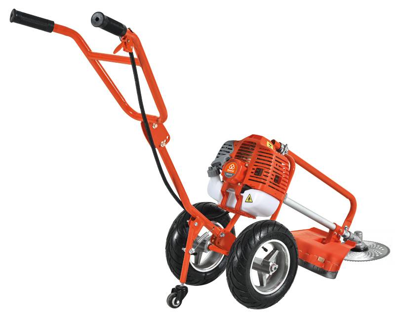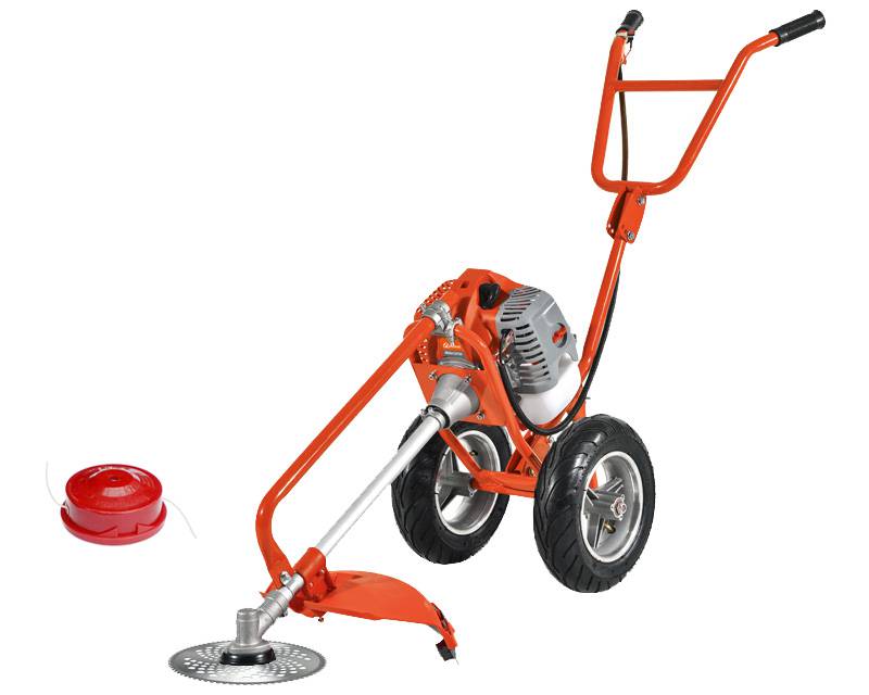 Græstrimmer på hjul med 52 cc med ekstra forstærkning fra motor til gearkasse. Denne variant er desuden udstyret med store lufthjul og håndtag, som nemt kan justeres i højden.