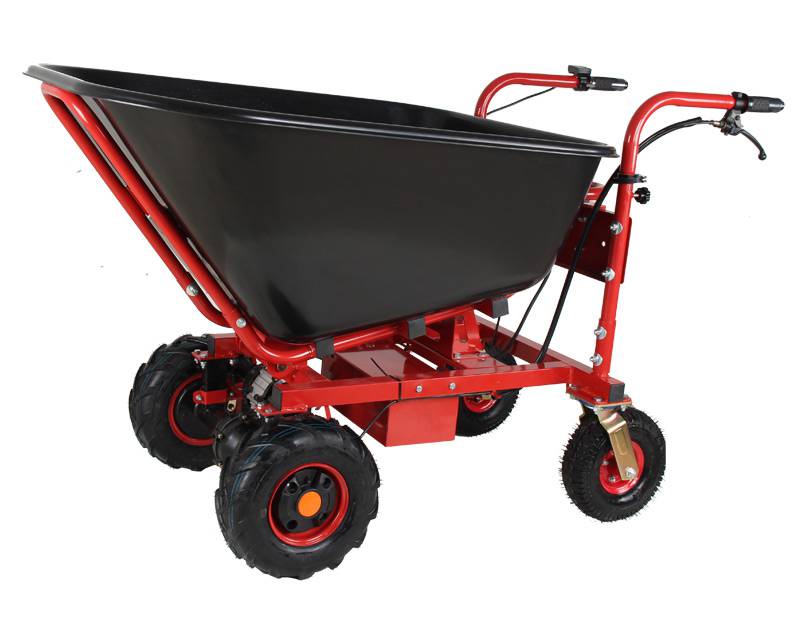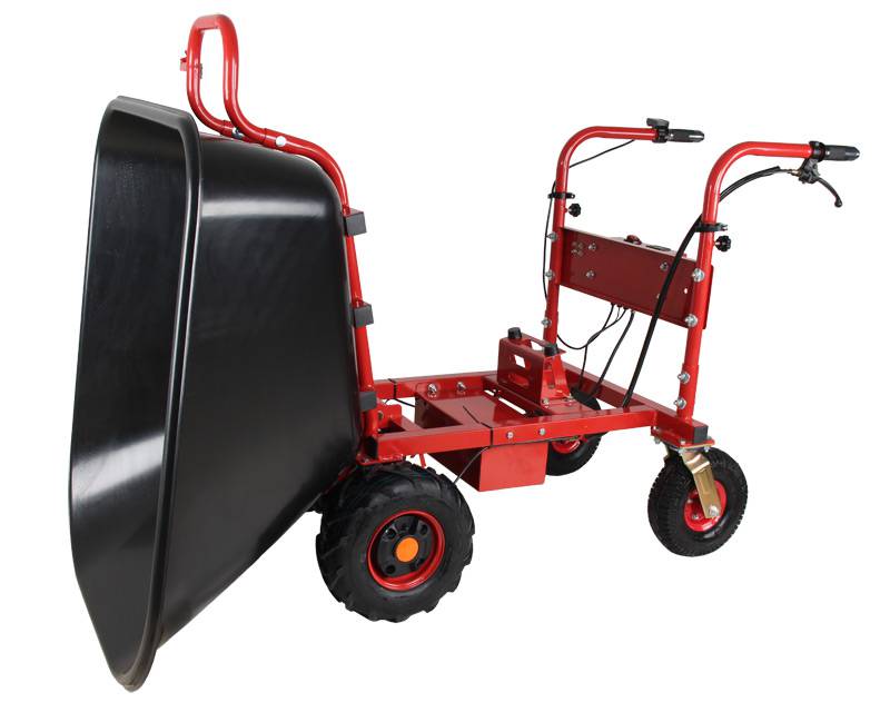 4-hjulet trillebør med batteri og 160 liters plastik kar og en læsseevne på op til 200 kg. Manuel tipfunktin og en driftstid op til 8 timer.