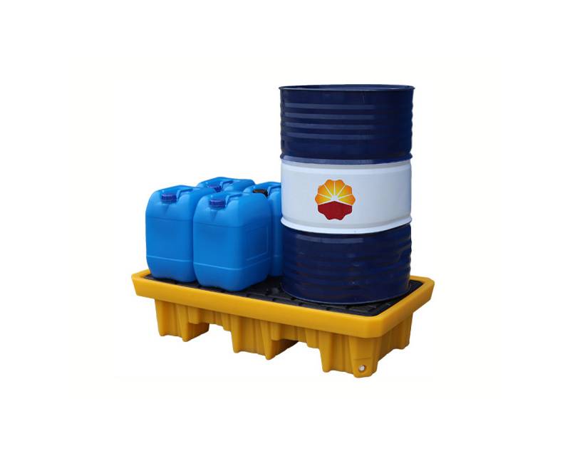 Stor olieopsamlingsbakke til 2 stk. 100 liters tromler. Kraftig konstruktion i polyethylen med rist og aftapningsstuds.