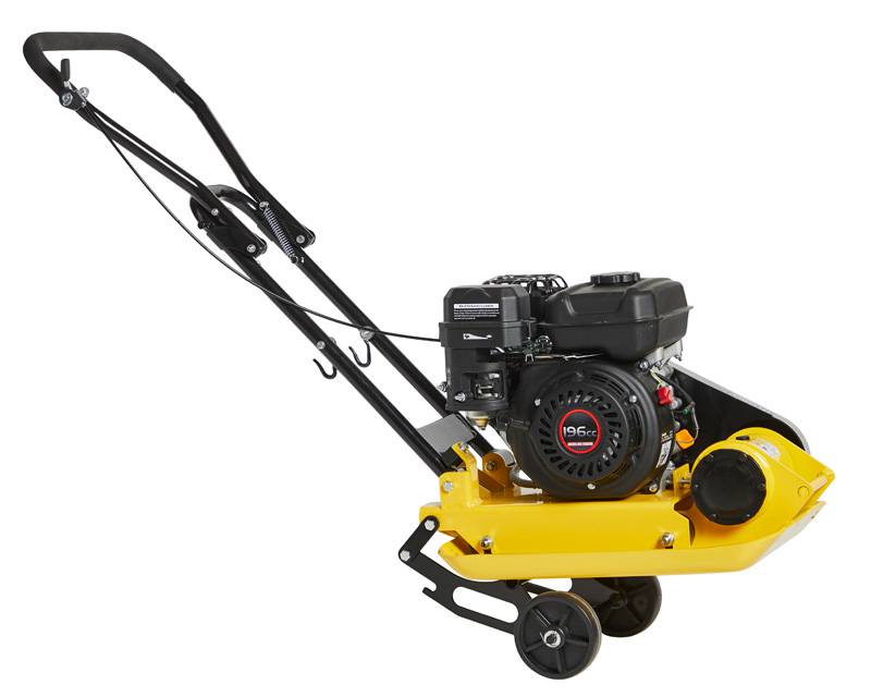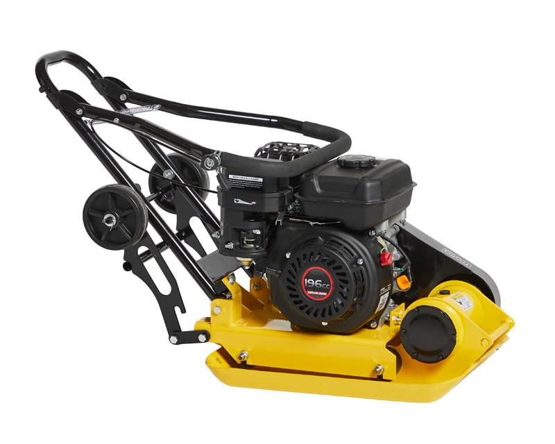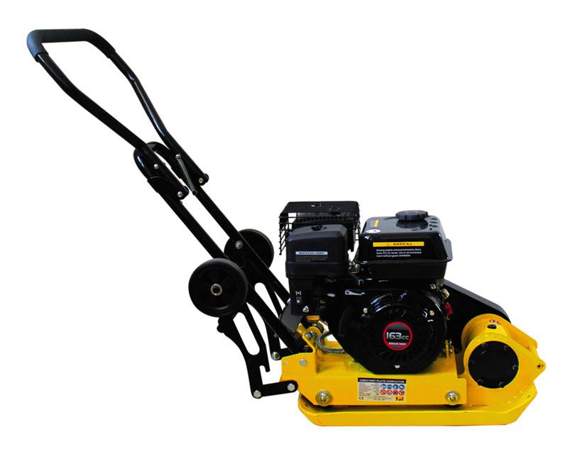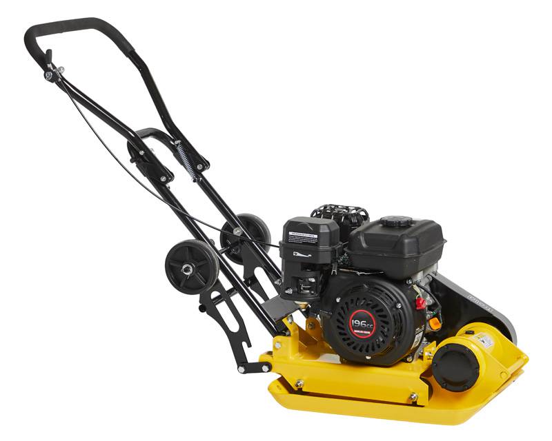 60 kg pladevibrator med kørehjul og 6,5 hk benzinmotor.
