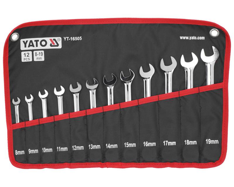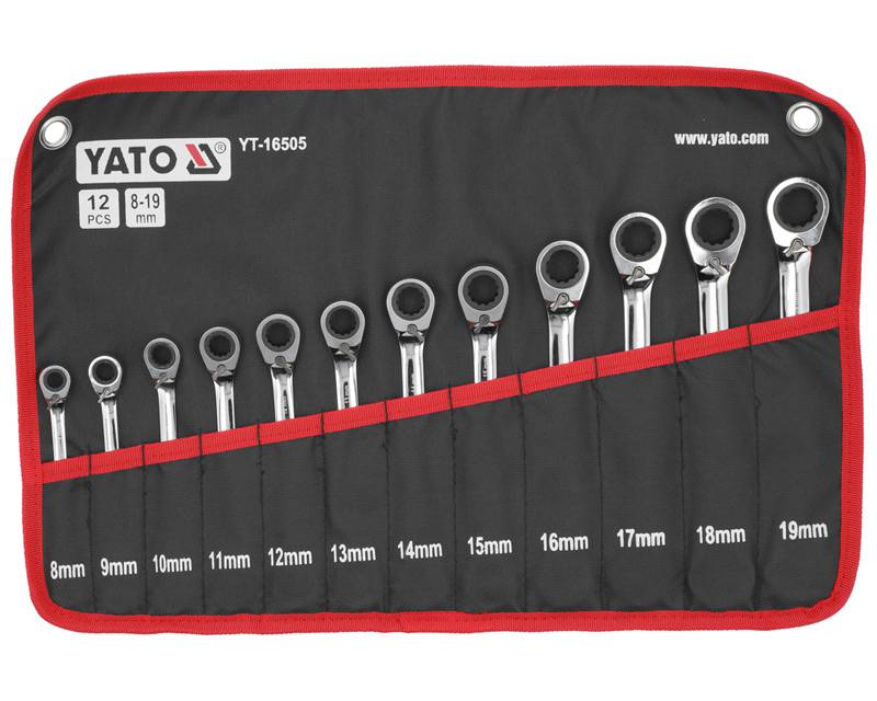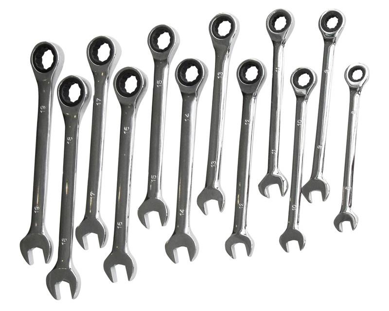 12 stk. ringgaffelnøgler med skraldefunktion. Top kvalitet i Chrome Vanadium med god overfladebehandling.