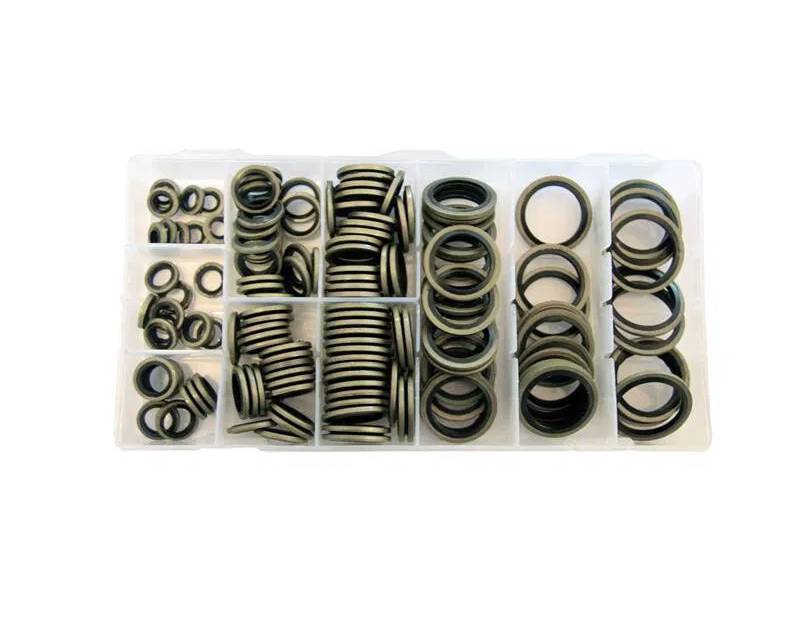 Sortiment med 150 stk. oliepakninger i forskellige metriske størrelser. Leveres i plastikæske med låg.