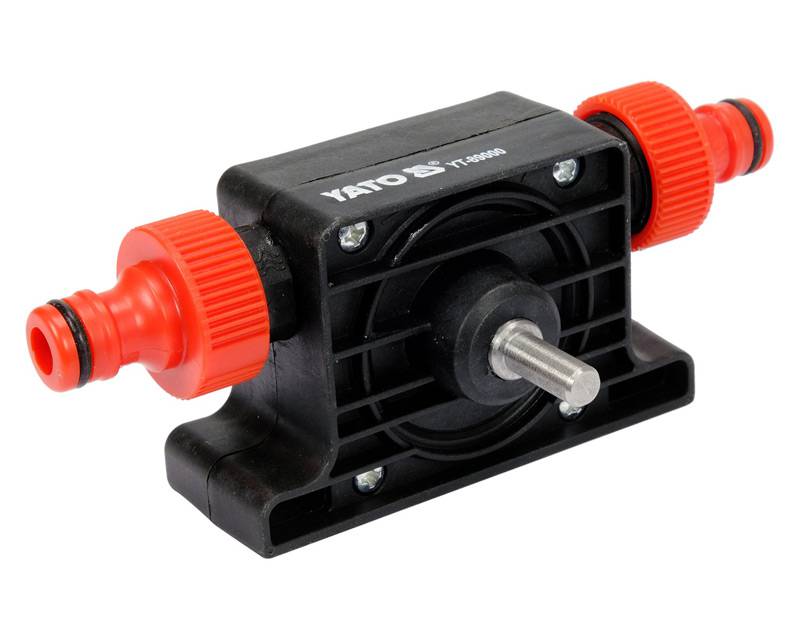 Universal vandpumpe til montering på almindelig boremaskine. Meget nem og effektiv måde at flytte vand på: Du tilslutter blot en vandslange (1/2") på begge sider af pumpen, og kan derefter flytte op til 40 liter/minut.