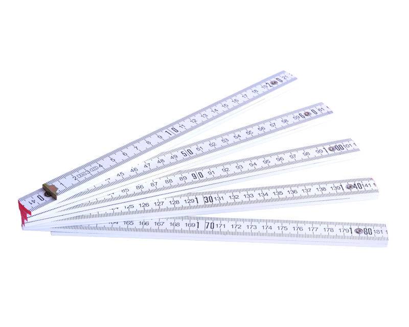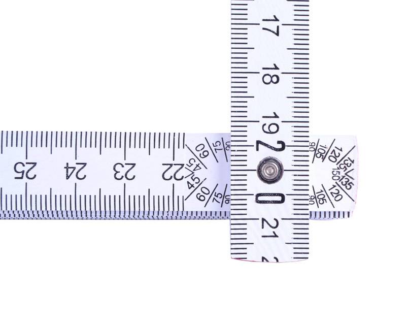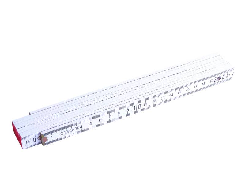 2 meter lang tommestok i hvidmalet træ med vinkelmåler / grader på første led (fra begge sider). Der er 15° interval på vinkelmåleren - se også billederne. Ellers er tommestokken som alle andre modeller, dog uden låse funktion i leddene, da det ellers ville være svært at bruge vinkelmåleren.
