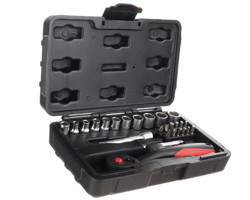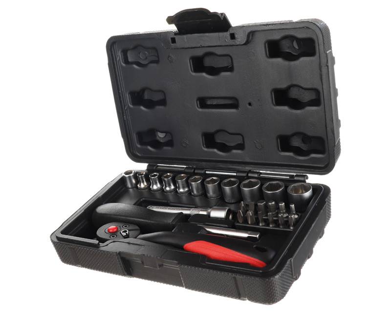 Kvalitets ¼" topnøglesæt med både skraldenøgle, ¼" skruetrækker, forlænger, toppe og bits.