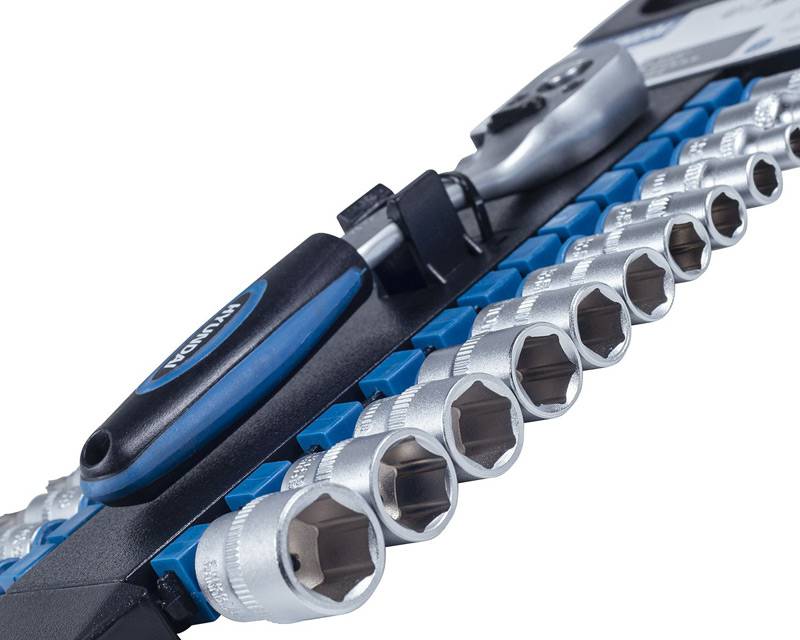 Kompakt topnøglesæt fra Hyundai med det mest brugte. Leveres med skraldenøgle, 12 toppe og 14 bits (lige, phillips, torx, hex) i høj kvalitet.