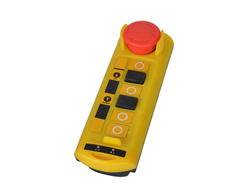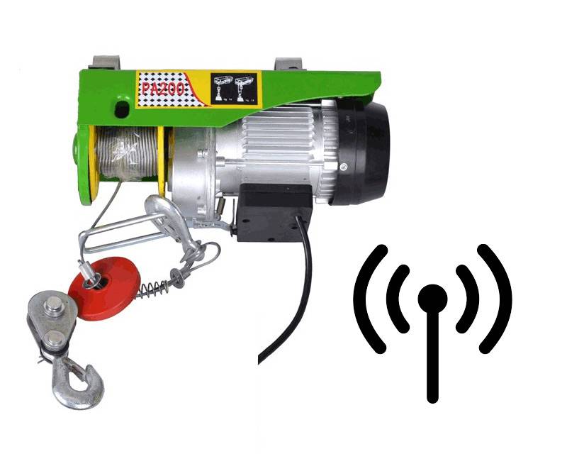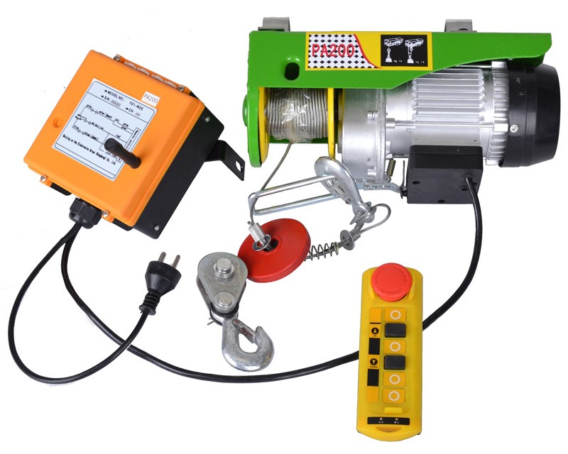 Elektrisk trækspil med trådløs fjernbetjening med klassisk nødstop knap, som vist på billedet. Løfter op til 200 kg med dobbelt wire.