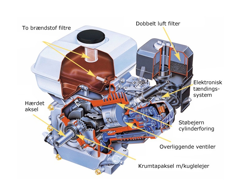 Selve Honda GP200 motoren er udstyret med 19 mm hærdet krumtapaksel med kuglelejer, støbejerns cylinderforing, 2 brændstof filtre, dobbelt luftfilter, elektronisk tænding og overliggende ventiler.