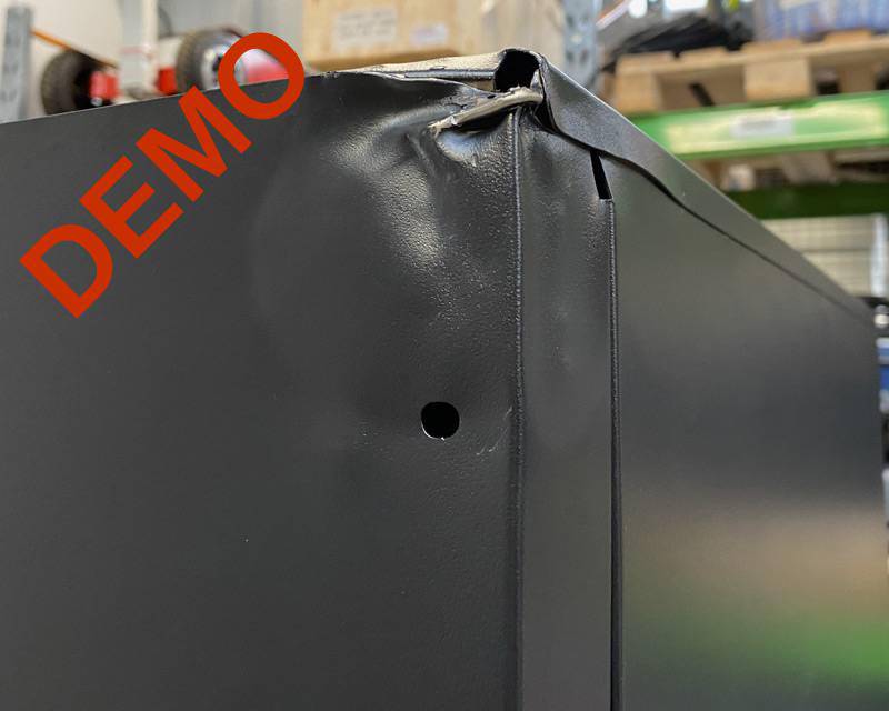 Har fået en et par skader på dels på bagsiden af højskabet og især på hjørnet (se billede) - er rettet som meget som det er muligt på vores værksted. Underskabe + bordplade har ikke skader. Hvis man kan leve med disse knubs, kan man få meget for lidt.