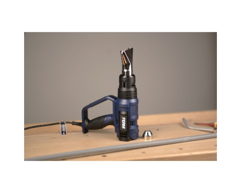 Professionel varmepistol fra FERM en effekt på 2000 watt. Denne model har trinløs justering af temperatur op til 600 °C og 3 forskellige indstillingsmuligheder, herunder også en fast indstilling til lav varme. Bemærk også den praktiske udformning af håndtaget, som gør at man kan placere varmepistol på en plan overflade og få varmen dirigeret opad. Denne maskine har en egenvægt på kun 900 gram.
